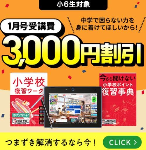 今なら進研ゼミ中学準備講座(小6)で1月号受講費が3,000円割引になるお得なキャンペーンを開催しています。